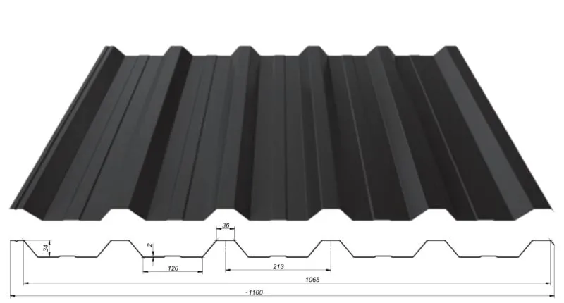 Blachotrapéz trapézový plech T35 plus PE 25 lesk má efektivní šířku 1065 mm a délku do délky 12,00 m. Tloušťka ocelového plechu je 0,7 mm.