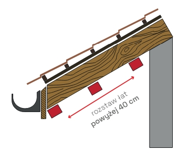 Rozteč latí je maximálně 40 cm (1) a (2). U větší vzdálenosti okrajů, je třeba vložit latě. (3) a (4)