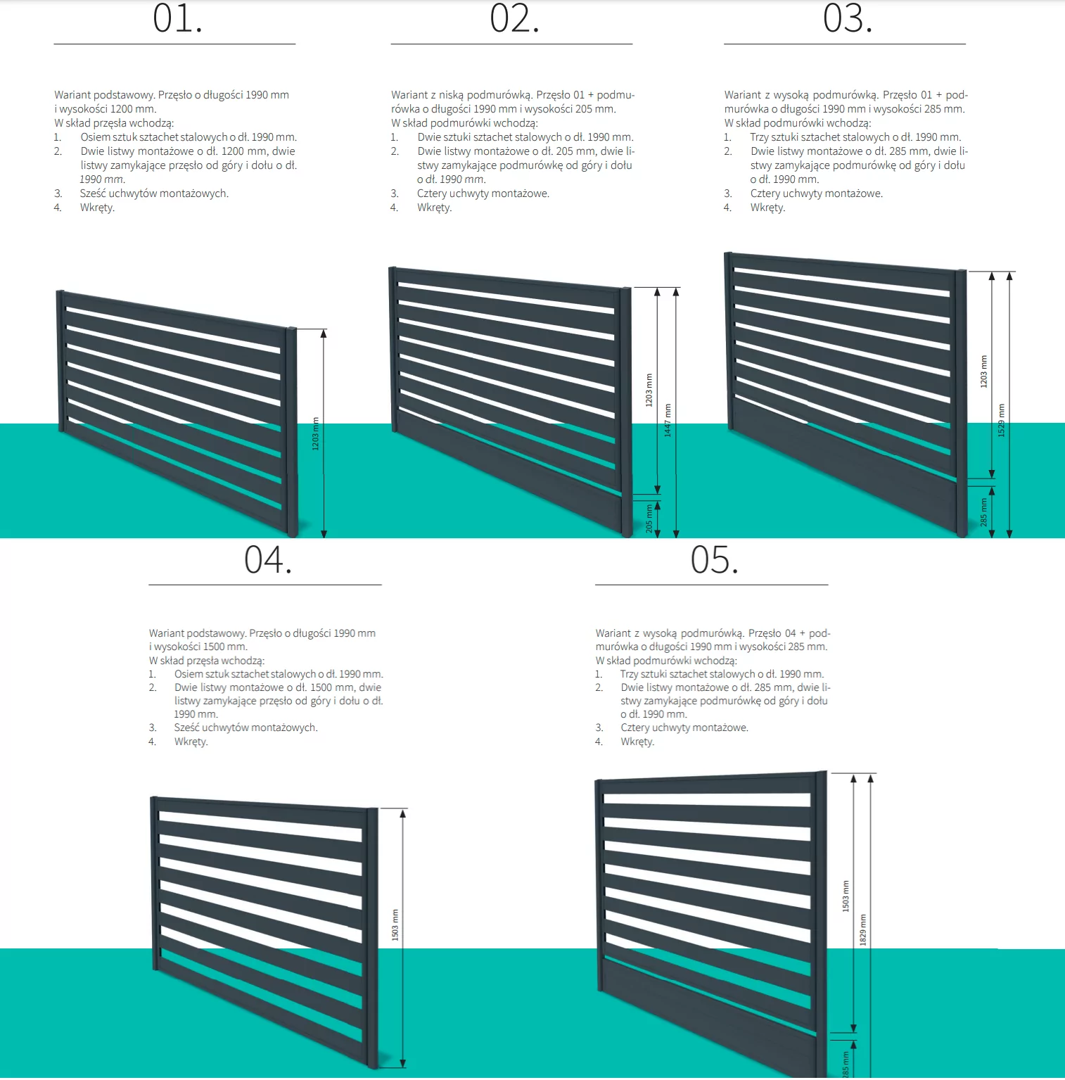 - Tyto ploty jsou k dispozici v 5 různých výškách (délka modulu plotové kolejnice x výška):
